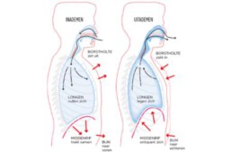 Een goede ademhaling draait minder om hoeveel lucht je inademt, maar meer om hoe je ademt. “Inademen is een actieve beweging”, legt Marie-Laure uit. “Verschillende spieren trekken samen, met het middenrif als belangrijkste ademhalingsspier.” Dat middenrif zakt bij het inademen, waardoor de longen zich uitzetten en zich vullen met lucht. Door die beweging komt er druk op de buikorganen, waardoor de buik naar voren beweegt. “Er wordt vaak gesproken over buik- versus borstademhaling, maar in werkelijkheid bewegen borst en buik altijd samen.” Het probleem zit meestal bij het uitademen. “Veel mensen forceren die: ze trekken hun buik in of persen de lucht eruit. Terwijl uitademen in rust passief verloopt en vooral langer duurt dan inademen.” Dat forceren verstoort het ademritme en kan klachten veroorzaken. Ook wanneer je te kort uitademt, kan dat de volgende inademing nadelig beïnvloeden.