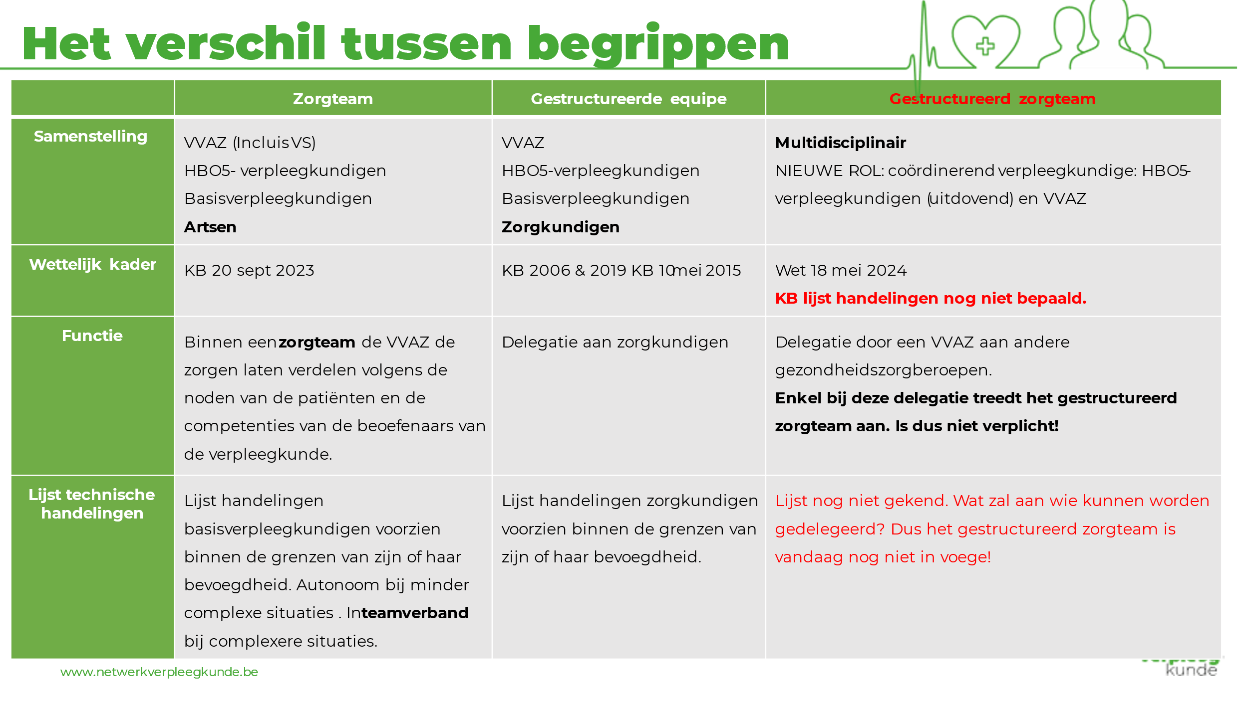 Sinds de nieuwe wetgeving duiken nieuwe termen op in de verpleegkunde en dat leidt hier en daar tot verwarring. Vooral de begrippen ‘gestructureerde equipe’ en ‘gestructureerd zorgteam’ worden door elkaar gehaald. Toch gaat het om twee verschillende vormen van samenwerking, met elk hun eigen regels en context.